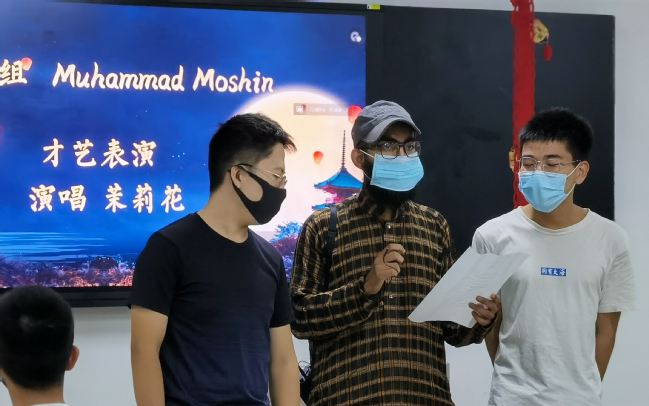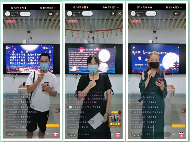 活动以“话说中秋”英文短片开场,引领大家进入“丹桂飘香沁心脾,中秋佳节共团圆”的热闹氛围。活动现场的中国学生用动听的歌声表达对远方亲人的思念,用流利的英语诵读经典隽永的诗歌华章,讲述流传千年的中国故事,展现了别样的意境美;留学生们则用中文诉说着对第二故乡——中国,和中华文化的热爱,中西文化在这中秋月圆之夜完美交融,现场洋溢着浓浓的节日氛围。本次活动的一大特点是线上线下相结合,观众们通过直播平台发送祝福语比拼手气、有奖互动猜诗等环节,让活动持续升温。