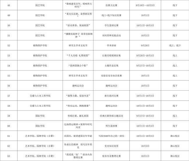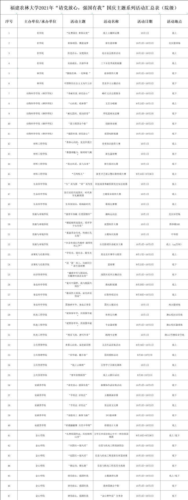 据悉,本次“请党放心,强国有我”国庆主题系列活动共将开展活动74项,其中校级层面活动11项,院级层面活动63项。具体如下: