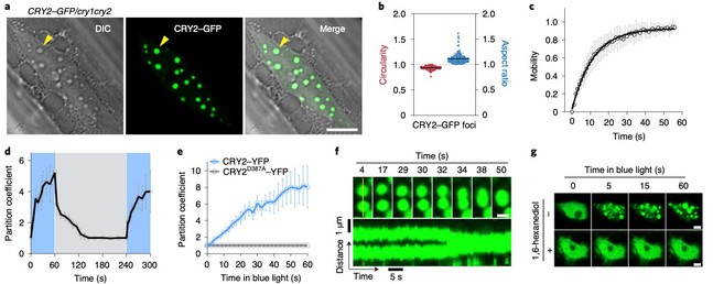 光是调控生物体内基因表达与昼夜节律的重要环境因子,但是光如何影响RNA代谢并不清楚。该研究首先通过m6A-seq发现,蓝光诱导拟南芥转录组m6A甲基化,而蓝光受体突变体cry1cry2缺乏蓝光反应,特别是生物钟相关基因的m6A甲基化水平在cry1cry2突变体中的降低尤为明显。随后,研究者通过体内体外实验证明了CRY2和m6A“编码器”(writer)复合体(MTA/MTB/FIP37)之间的相互作用,但是令人惊讶的是蓝光受体与编码器之间的亲和性并不具有通常所见的光诱导变化现象。进一步研究表明,CRY2在蓝光下发生液-液相分离(Liquid-liquid Phase Separation)从而形成光小体(photobody),并募集“m6A编码器”复合体至光小体中,这一现象表明蓝光所致的CRY2相分离能够提高m6A“编码器”复合体在光小体中的浓度,促进RNA甲基化的发生,进而调节植物体内mRNA的代谢和稳态。随后研究发现cry1cry2和mta突变体都表现出生物钟节律周期变长的表型,且生物钟核心组分CCA1 mRNA蓝光下甲基化水平在cry1cry2和mta突变体中均明显降低。RNA降解实验结果显示cry1cry2和mta突变体中CCA1 mRNA 在蓝光下降解速率较野生型显著变慢,进一步证明了CRY2通过影响m6A“编码器”复合体在蓝光下的活性来调节植物生物钟节律。