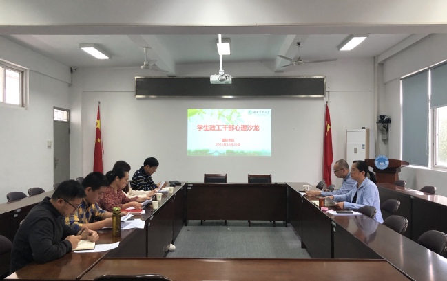 10月20日下午,国际学院在明北附303会议室举办学生政工干部心理沙龙活动,学院党委书记张华英受邀与全体政工干部共同研讨。