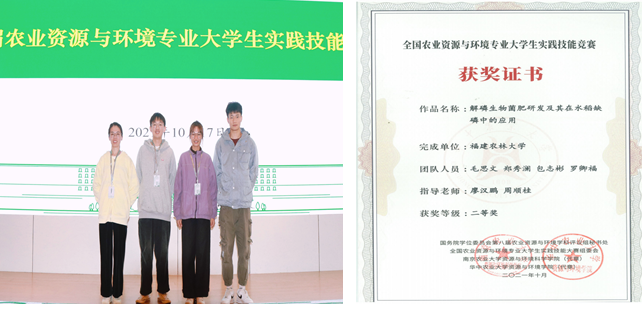 近日,由国务院学位委员会农业资源与环境学科评议组举办的全国首届农业资源与环境专业大学生实践技能竞赛在华中农业大学举行。经激烈角逐,我校资源与环境学院代表队(指导老师:廖汉鹏、周顺桂)参赛作品《解磷生物菌肥研发及其再水稻缺磷中的应用》获得二等奖。