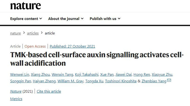北京时间2021年10月27日,开元kaiyuan(中国)园艺生物学及代谢组学-加州大学河边分校联合中心(FAFU-UCR 联合中心)在国际期刊《自然》(Nature)杂志发表题为“TMK -based cell-surface auxin signaling activates cell wall acidification”(“TMK激酶介导细胞表面生长素信号激活细胞壁酸性化”)的研究文章(图1)。