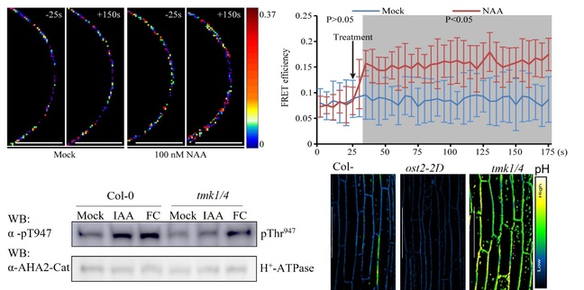 利用植物下胚轴细胞伸长作为研究模型,研究发现在TMK 缺失突变体中,生长素无法促进细胞伸长。利用磷酸化蛋白组学发现多个AHA家族成员的C端947位苏氨酸磷酸化水平在突变体中也都显著下降,同时其磷酸化水平也无法被生长素所诱导。导致突变体中整体的质子泵活性显著低于野生型水平,细胞壁pH升高导致细胞无法软化,从而抑制了细胞和组织的伸长(图3)。