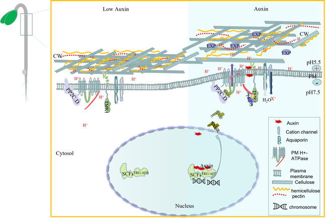 生长素(auxin)是植物中最早发现的激素,因其促进生长而被命名。生长素作为植物中最重要的激素之一,几乎参与了植物所有的生长发育过程以及对复杂环境适应过程。早在十九世纪初期,研究就发现生长素可以调控植物的生长,部分依赖于调控细胞的伸长。半个世纪前,科学家根据生长素,细胞壁酸性化及细胞伸长的关联性,提出了著名的“酸性生长理论”,然而酸性生长理论最核心机制一直未得到解析,也成了植物生长素领域一大疑问。