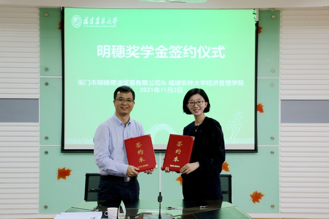 11月3日,经济管理学院与厦门市明穗粮油贸易有限公司“明穗奖学金”签约仪式在经管楼509举行。厦门市明穗粮油贸易有限公司人力资源总监汪汇文、人力资源专员雷婷玲,经济管理学院党委副书记李健英、副院长李坤明、公共管理学院党委副书记郑龙章、食品科学学院团委书记和经济管理学院会计系主任谢帮生、经济系主任郑海荣、农业经济管理系副主任苏宝财出席仪式。仪式由李健英主持。
