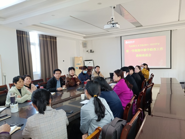 11月11日下午,马克思主义学院在明德楼613会议室召开2021-2022学年第一学期期中教学检查工作教师座谈会。学院党委书记雷国铨、院长刘新玲、各教研部主任、副主任及各教研部教师代表参加会议。会议由教学秘书曾丽萍主持。