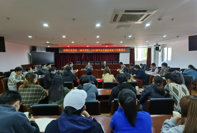 11月23日下午,动物科学学院(蜂学学院)在学院会议室召开2022届毕业生就业创业工作推进会。学院领导班子成员、研究生导师代表、本科毕业班班主任、教学秘书、辅导员、毕业班班干部等参加。会议由学院党委书记黄毅军主持。