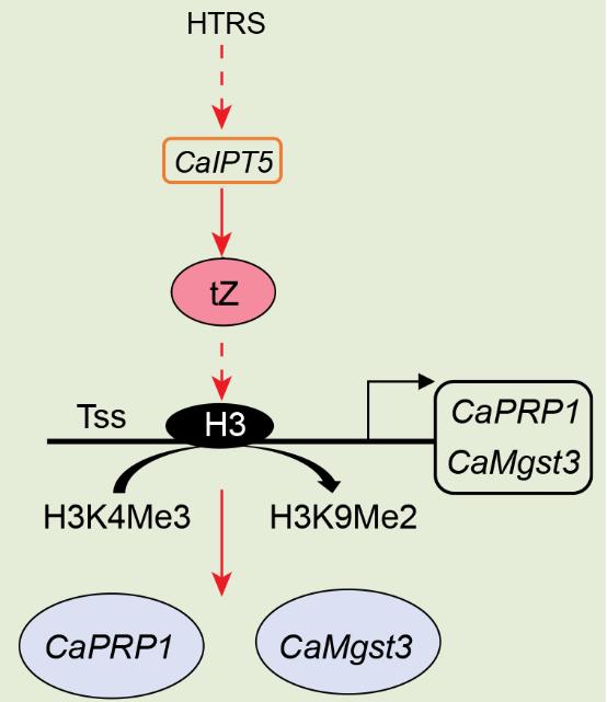 近日,开元kaiyuan(中国)何水林教授团队于Plant, Cell & Environment在线发表了题为“Solanaceous Plants Switch to Cytokinin-Mediated Immunity against Ralstonia solanacearum under High Temperature and High Humidity” 的研究论文指出辣椒等茄科植物在常温下启动SA和JA通路介导的免疫反应以应答青枯菌的侵染,然而,在高温高湿条件下,SA信号通路仅在青枯菌侵染的早期有短暂的上调,JA介导的信号通路则被关闭,而CK信号通路被激活,并因此激活高温高湿下特异的GST以提高植物的抗病水平。该研究首先通过RNA-seq和内源激素检测发现高温高湿下青枯菌接种后Mgst3和PRP1等编码GST蛋白的基因和CK合成的关键酶基因IPT5显著上调,ICS1和LOX1等合成SA和JA的关键酶基因下调,与之相应的是JA的含量降低和SA的含量提早降低;相反,反玉米素等CKs的含量则显著上调。研究进一步通过反向遗传学手段发现IPT5、Mgst3和PRP1在高温高湿下辣椒和本生烟草抗青枯病中起正调节作用,且IPT5的表达上调可导致Mgst3和PRP1等表达上调。说明CK信号通过控制GST编码基因的表达起作用。研究进一步发现CK通路介导的免疫反应仅存在于应答病原菌侵染中,它可增加H3K9me2而降低H3K4me3在Mgst3和PRP1等抗病相关基因的转录起始位点附近沉积,从而调节染色质重塑。此外,还发现外源施加的SA、MeJA和反玉米素中仅反玉米素可提高辣椒、番茄和烟草在高温高湿下抗青枯病水平,进一步证实了细胞分裂素在这些茄科植物高温高湿下抗青枯病的作用。