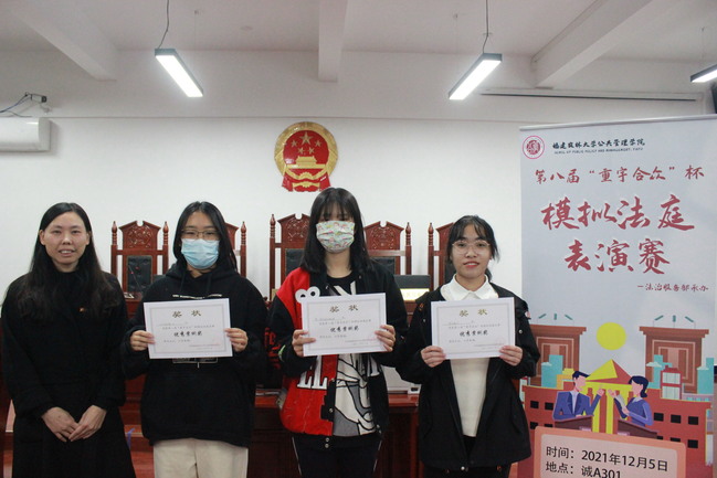 12月5日,公共管理学院在诚智楼A301举办第八届“重宇合众”杯模拟法庭比赛,共8支队伍参赛。福建重宇合众(福州)律师事务所律师陈青红,公共管理学院法学系杨晓丹、汤凌燕老师担任此次比赛评委。