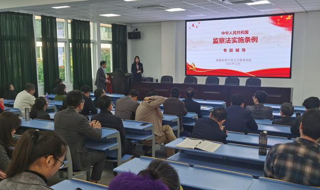 12月7日下午,公共管理学院组织《中华人民共和国监察法实施条例》(以下简称《条例》)宣讲报告会,邀请学院法学系杨晓丹副教授为全院教师做《条例》学习辅导报告。