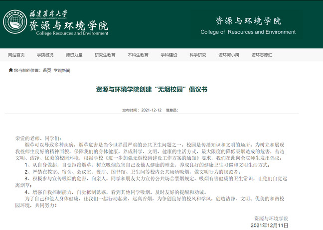 12月11日,为引导师生树立和展现良好的精神面貌,保障师生身体健康,养成科学、文明、健康的生活方式,最大限度降低吸烟造成的危害,营造文明、洁净、优美的校园环境,资源与环境学院根据学校《进一步加强无烟校园建设工作方案的通知》要求,向全院师生发起创建“无烟校园”倡议。
