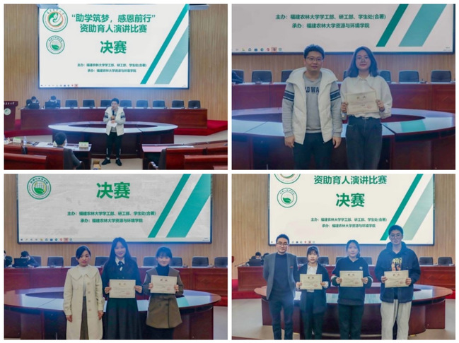12月11日,由校学生工作部主办,资源与环境学院承办的“助学筑梦,感恩前行”资助育人演讲比赛决赛在博学报告厅举行。本次决赛评委由福州船政交通职业学院黄其连老师、材料工程学院郭炳春老师、动物科学学院吴群老师以及生命科学学院黄丽丽老师担任。