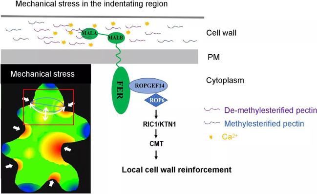 植物细胞被细胞壁紧紧包埋着。一直以来人们普遍认为植物细胞壁只是一种给细胞提供支撑和保护作用的惰性结构。但近几年来,科学界对于细胞壁的看法发生了巨大的改变,因为随着研究的深入,越来越多的新发现使人们意识到,细胞壁是高度动态化且可塑性极强。植物细胞壁主要是由多糖类的纤维素,半纤维素,果胶及少量一些糖基蛋白组成。植物可以通过改变细胞壁的组分及结构来应对自身或者外部环境的化学(植物激素,小肽等)或者物理刺激(机械胁迫)。植物通过监测,感应细胞壁动力学变化及机械胁迫,维持细胞稳态和完整性,来调控生长发育的方方面面,包括细胞生长和形态建成及植物对外界环境的适应性,但是这背后的分子机制仍然有待进一步的揭示。