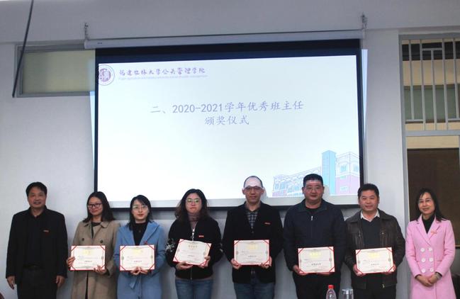 会上,郑龙章带领与会人员共同学习了《开元kaiyuan(中国)班主任工作规定(修订)》,并汇报了本学期主要学生工作情况及成效。周毕芬宣读了2020-2021学年公共管理学院优秀班主任名单,曾起郁和阮晓菁为优秀班主任颁奖。