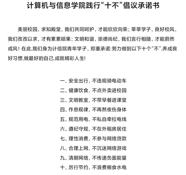 12月16日,计算机与信息学院开展了“践行‘十不’精神,沐浴文明新风——‘十不’倡议承诺书签名活动”。活动以宿舍为单位进行。