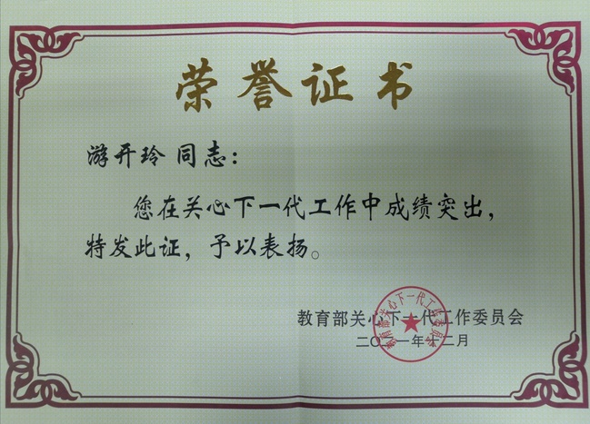 12月22日,教育部关工委召开第六次工作会议暨成立30周年纪念大会,第十届全国人大常委会副委员长、中国关工委主任顾秀莲,教育部党组书记、部长怀进鹏出席会议并讲话,教育部党组成员、副部长宋德民,教育部关工委顾问朱善璐出席会议。教育部关工委主任李卫红主持会议并作工作报告。大会通报表扬了491个“全国教育系统关心下一代工作先进集体”,779名“全国教育系统关心下一代工作先进工作者”、127名“全国教育系统关心下一代工作突出贡献者”。 我校关工委被评为“全国教育系统关心下一代工作先进集体”、原校关工委常务副主任游开玲被评为“全国教育系统关心下一代工作先进工作者”。这是我校继2007年、2011年、2016年后第四次获得此项殊荣。