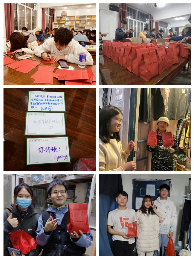 寒冬送暖,爱心助考。学院高度重视学生考研工作,先后为考研学生举办考研培训、经验交流等,营造浓厚的学习氛围。临考前,组织开展“情系研路,同心追梦”志愿服务活动,饱含祝福的礼袋、贺卡、视频让考研学生备感学院大家庭的温暖,有助于缓解考试压力,坚定信心,鼓舞士气。