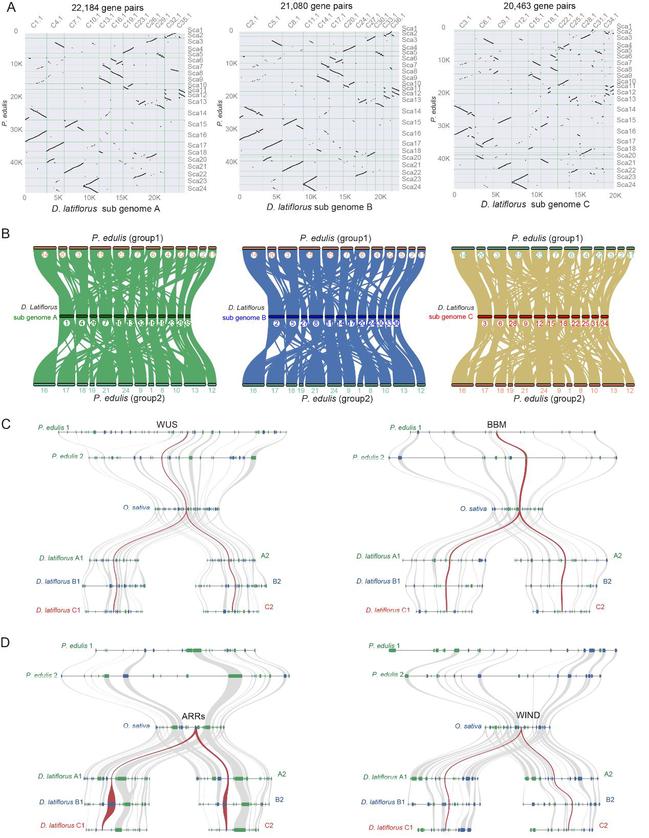 散生竹和丛生竹具有极大的差异,本研究首次公布了染色体水平的丛生竹麻竹基因组,该六倍体麻竹基因组揭示了散生竹和丛生竹之间的宏观共线性关系及部分微观共线性的差异,为后续在进化层面及基因功能机制研究提供依据,有望最终能够逐步揭示散生和丛生的分子机制,以及揭示developmental genes (DG)基因所造成的遗传转化难易差异,该基因组测序的完成为充分利用竹类资源奠定坚实的理论基础。