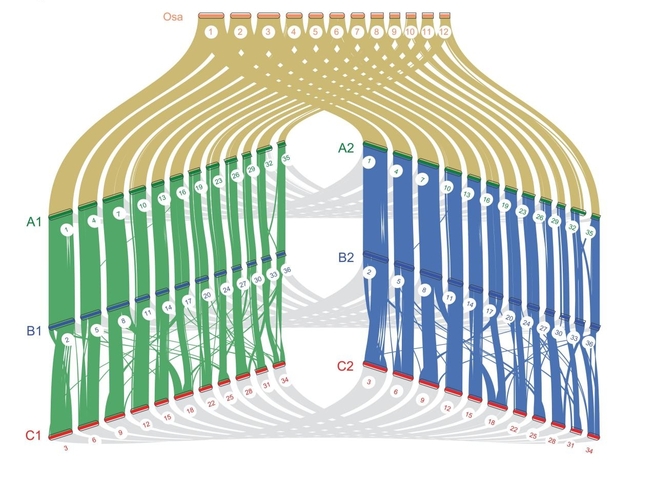 利用PacBio平台,结合Illumina和Hi-C技术,采用ALLHiC算法(Zhang et al. 2019)组装得到染色体水平的六倍体麻竹分型基因组(基因组大小为2737Mb),该基因组代表了目前已报道的基因组最大的竹种。