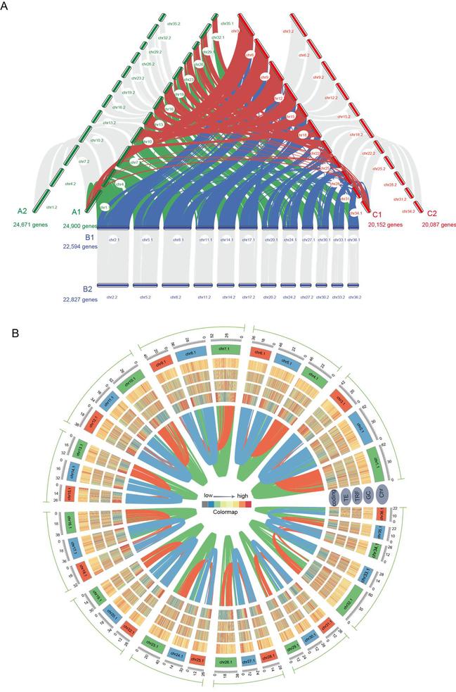 本研究将麻竹组装成三个分型亚基因组(AABBCC), 相对于C亚基因组而言,A和B两套亚基因组间具有更为一致的共线性关系。基于不同组织的转录组,结合相似性(homology-based searchers) 和从头预测(de novo prediction)对麻竹三个分型亚基因组共注释了135,231个蛋白质编码基因,识别了两套分型染色体之间存在大量遗传变异(SNVs和InDels),为研究亚基因组的进化关系及等位特异性表达奠定了基础。
