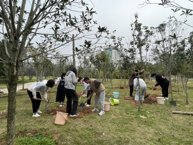师生们三五成组,配合有序,手持铁锹挖坑、扶苗夯土,植树现场劳动热情高、氛围浓,干的热火朝天。经过两个多小时的辛勤劳动,林学院师生于中华园内共栽种31棵马褂木,并对周边的环境进行了清理。