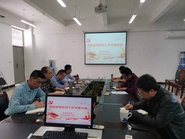 3月13日下午,林学院在诚A206召开校园疫情防控工作专题会议,学院党政领导班子参加会议,学院党委书记蓝天水主持会议。