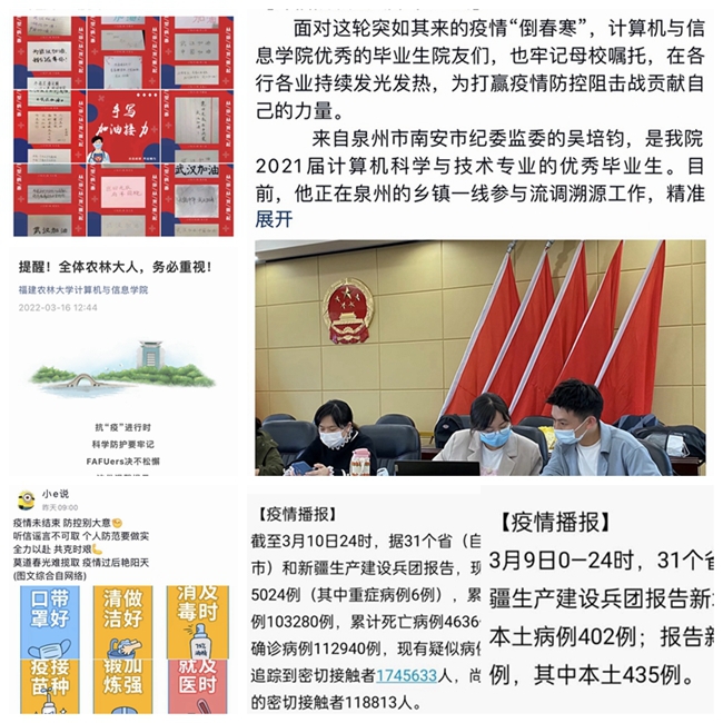 选树先进典型,发挥党团组织战斗堡垒和引领示范作用。学院制作在疫情防控一线的计信学子、优秀毕业生院友们的生动事迹,相关推文、空间说说、报道稿累计16篇次,阅读数突破10000余人次。学院青年志愿者在公共场所监督提醒师生正确佩戴口罩,今年参加相关工作的志愿者350余人次,累计志愿服务工时820余小时。