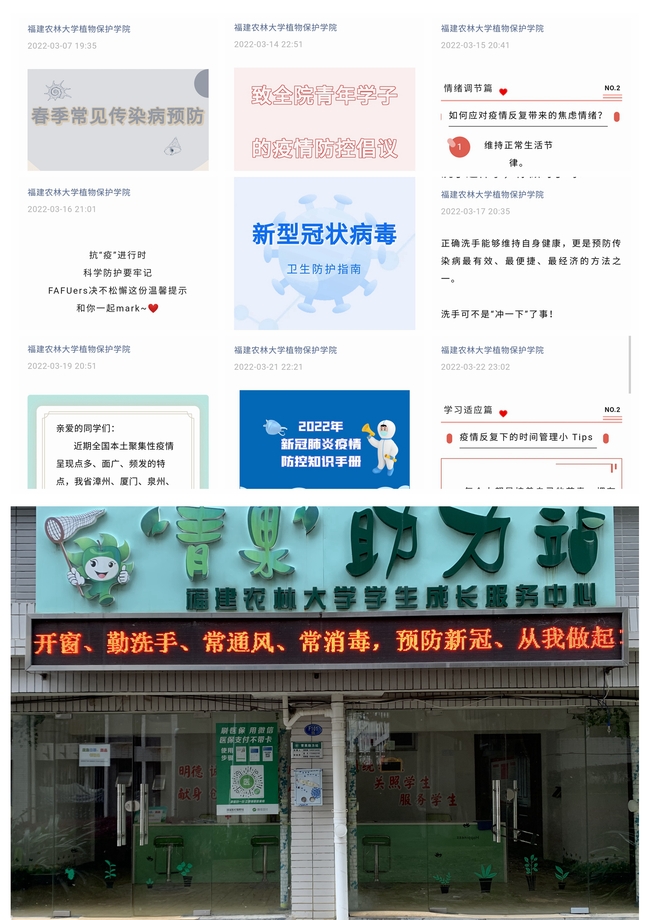 防疫宣传志愿服务。为及时全面宣传疫情防控相关通知和知识,防疫宣传志愿服务队利用QQ群通知、微信推文等形式向学生普及疫情防控的相关知识;在学院办公楼道和青果助力站的LED屏轮播疫情防控相关标语,同时组织开展有关疫情与传染病的线上知识竞赛,寓教于乐,加深学生对防疫知识的掌握。多渠道、全方位宣传防疫知识,营造浓厚的防疫抗疫氛围,培养学生主动落实疫情防控要求的意识,将学校对学生防疫的要求转化为学生的行动自觉。