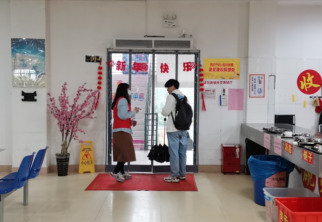 餐厅督导志愿服务。为引导就餐师生有序进入餐厅并佩戴口罩、保持安全距离间隔用餐,餐厅督导志愿服务队按照校团委和学院的要求,每日安排午晚两个班次,每个班次四名志愿者,三个出入口的志愿者对进入餐厅的师生进行口罩佩戴的劝导,为未携带口罩的师生提供口罩;大堂流动志愿者引导排队师生保持1米的安全社交距离,并提醒师生用餐期间间隔分散就坐。