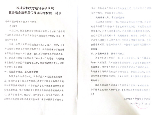 严管厚爱,有畏有为。协助汇编《植物保护学院疫情防控警示案例》,列举全国各地疫情防控工作中发现的反面典型案例,以案说理,线上线下在学院师生群体中等开展学习,明确校园封闭管理的纪律要求,强化规矩意识;协助组织建立党员师生服务队伍,解决学生在校园封闭管理中切实存在的“急难愁盼”问题,学院领导班子、教学督导深入线上课堂,共同提升网络教学质量。