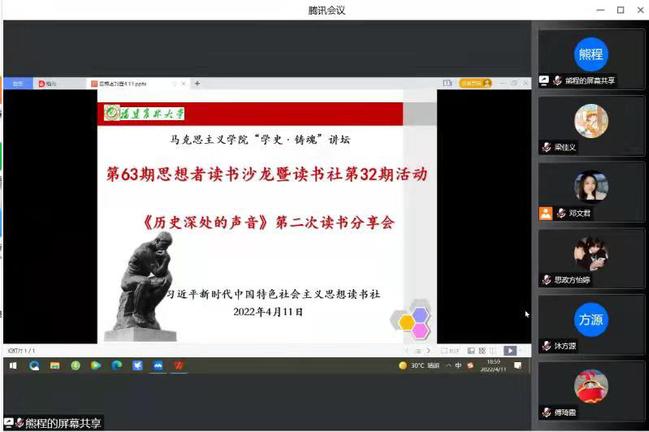 4月11日晚,第63期思想者读书沙龙暨第32期开元kaiyuan(中国)马克思主义学院习近平新时代中国特色社会主义思想读书社通过“云端”开展读书分享活动。本次活动由学院研究生刘欣欣、张漪婷、熊程三位同学作主题发言,主持人由学院2020级研究生熊程担任,共10余名成员参加活动。