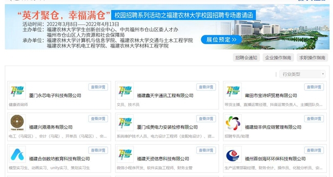 招聘会共吸引了福建新大陆通信科技股份有限公司、福建网龙计算机网络信息技术有限公司、福建星网锐捷网络有限公司、福建福顺微电子有限公司、福州市城投建筑有限公司、福建南平太阳电缆股份有限公司、中铝南铝(福建)铝结构技术开发有限公司等两百余家企业参会,累计为毕业生提供了2400余个就业岗位。据统计,此次线上招聘会共有2000余名学生参加,投递简历600余份,初步达成就业意向两百多人。