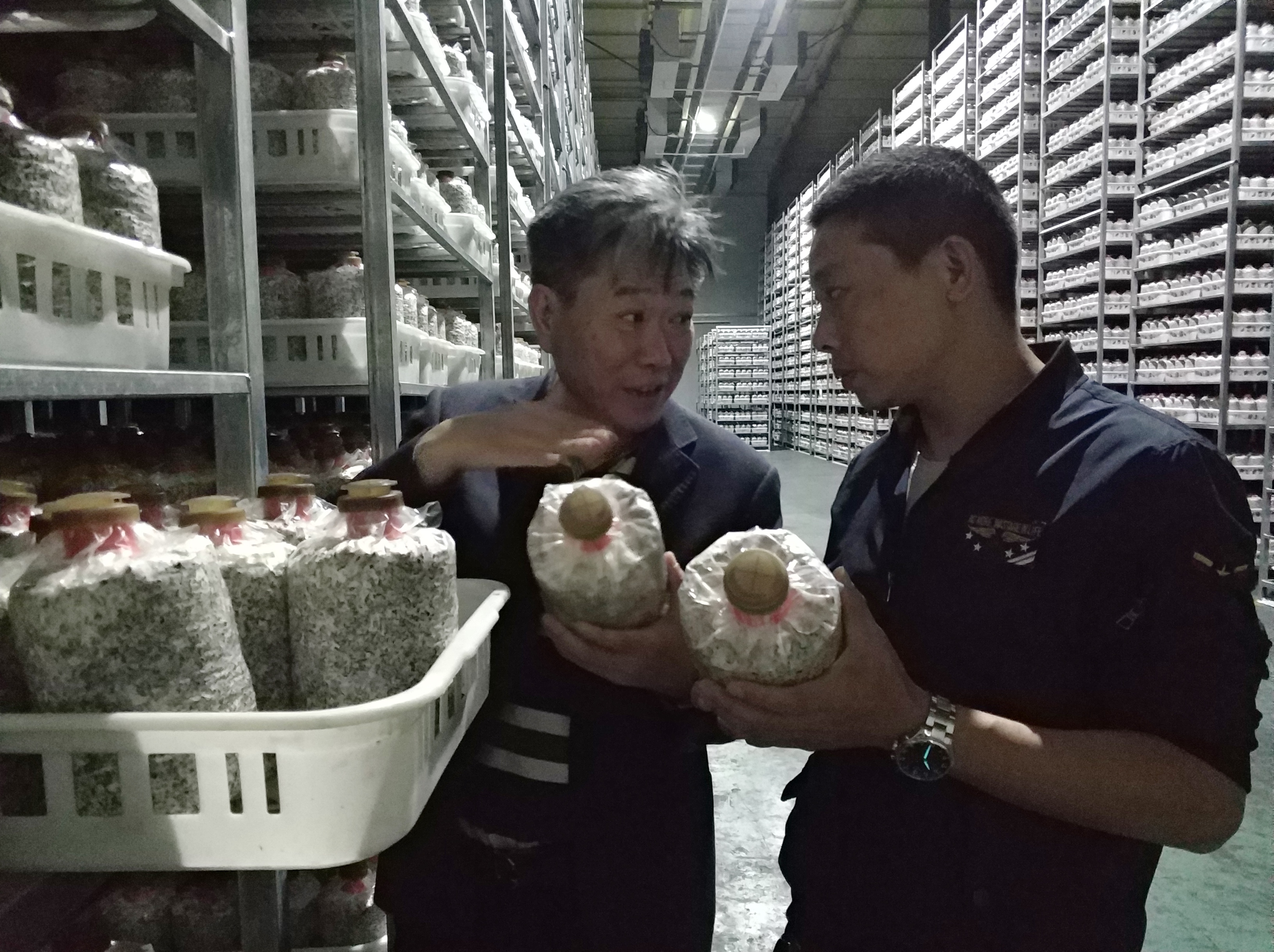 胡开辉(左)教授在宁德古田海鲜菇库房,进行海鲜菇养菌工艺指导。李佳欢/摄