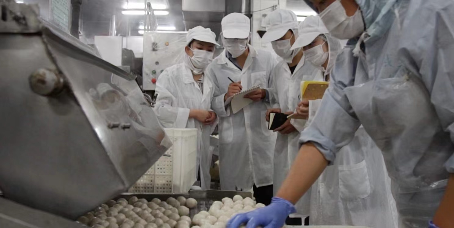 张怡(左一)教授在海欣公司鱼糜制品生产线进行指导。曾红亮/摄
