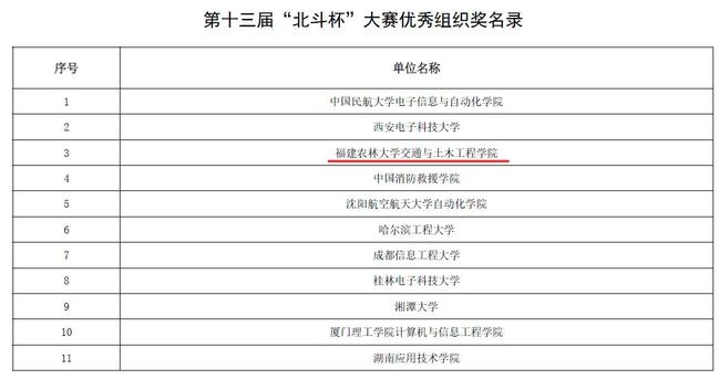 近日,第十三届“北斗杯”全国青少年科技创新大赛全国总决赛奖项结果揭晓,我校学生团队荣获一等奖2项、二等奖2项、三等奖3项,交通与土木工程学院荣获“北斗杯”大赛优秀组织奖。