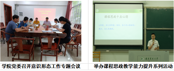 严明政治纪律,落实意识形态工作责任制。学院党委深入基层一线调研,不断健全意识形态工作体系,每年至少开展2次意识形态专题分析研判会议,及时掌握意识形态领域存在的倾向性和苗头性问题,成立意识形态领导小组,规范开展意识形态工作,加大课程思政培训力度,严格进行教师教材选用及编写的政治把关。