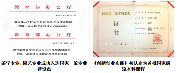 人才培养成果实现更高层次突破。10人入选福建省高层次人才计划,1人入选省百千万人才,1人获评教育部在线教育研究中心“智慧教学之星”,5名教师获得全国行业青年教师教学竞赛奖;茶学专业、园艺专业成功入选国家一流专业建设点,新办“智慧农业”专业,获全国生态文明信息化教学成果奖1项;《创新创业实践》被认定为首批国家级一流本科课程,省级一流本科课程8门;主编《茶业机械》获2020年度全国农业教育优秀教材。