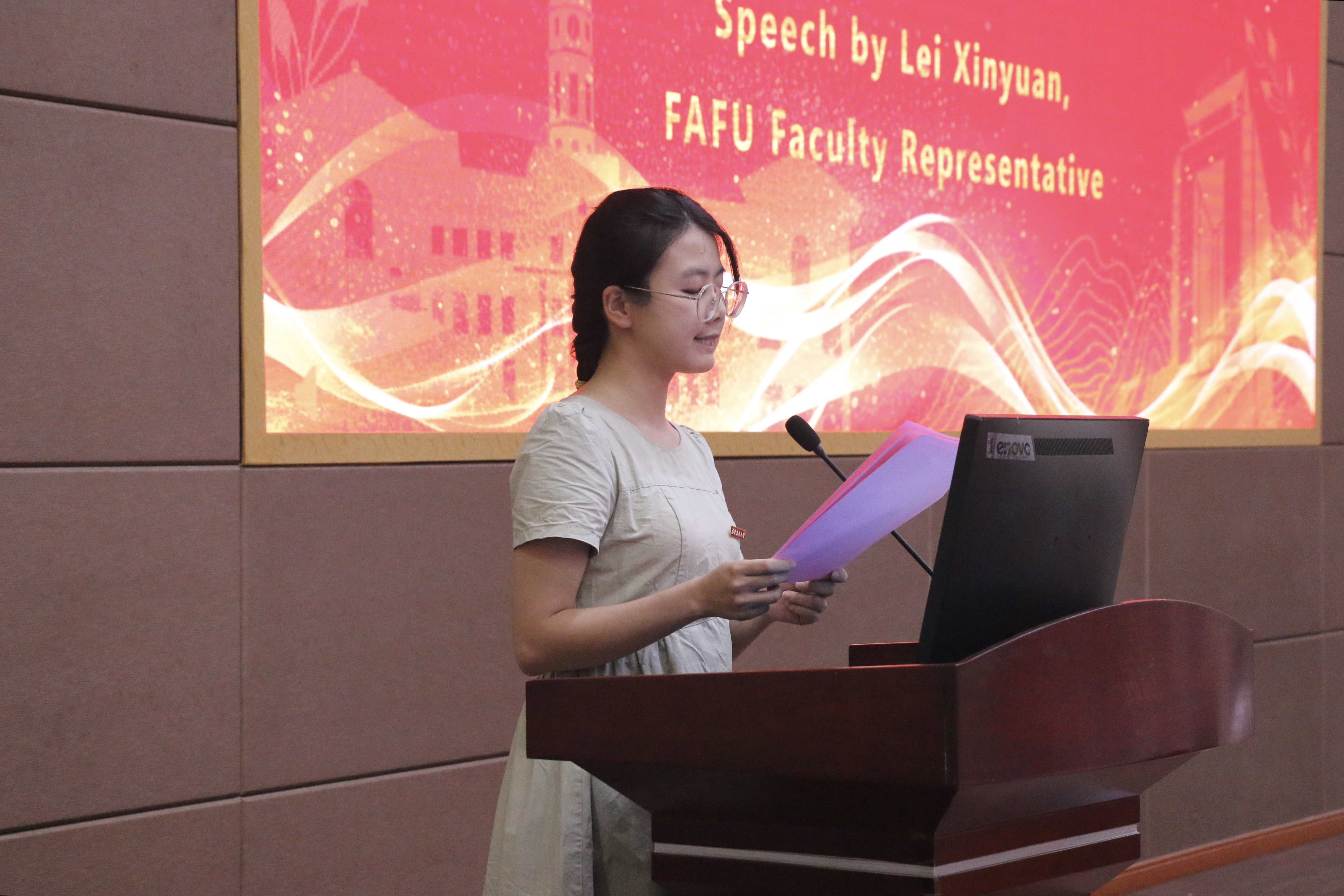 中外师生代表分别发言。中方教师代表雷馨圆分享了对新生的期望与建议;外方教师代表Desiree Sparks祝贺新生开启人生新篇章。新生代表汪诗语(2025级农林经济管理专业)和在校生代表林星羽(2024级风景园林专业)表达了传承学院精神、砥砺前行的决心。