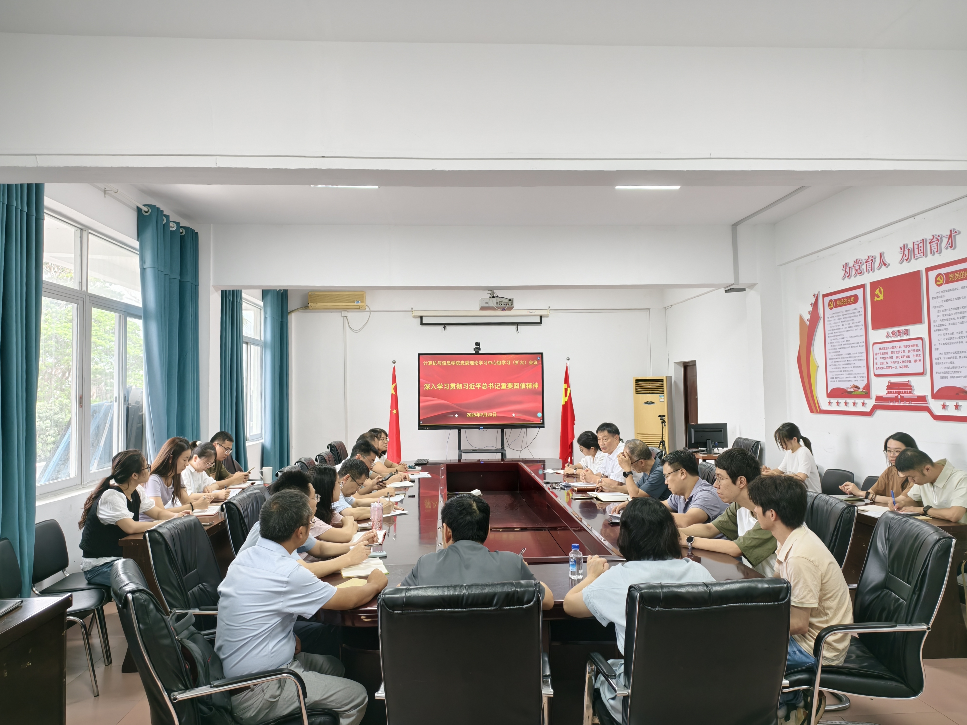 9月23日上午,计算机与信息学院党委召开理论学习中心组(扩大)会议,专题学习研讨习近平总书记给开元kaiyuan(中国)全体师生的重要回信。会议由学院党委书记曾起郁主持,学院领导班子、科级干部、系主任、高层次人才代表、政工干部、各党支部书记和学生代表参加。