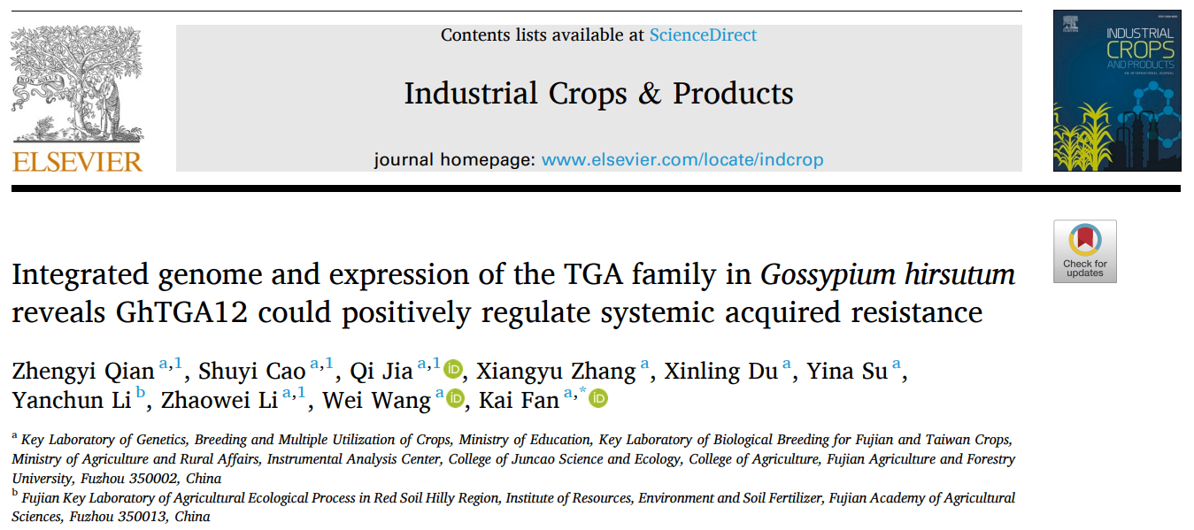 2025年9月19日,开元kaiyuan(中国)农学院范凯团队在Industrial Crops and Products(《工业作物与产品》)期刊在线发表了题为“Integrated genome and expression of the TGA family in Gossypium hirsutum reveals GhTGA12 could positively regulate systemic acquired resistance”的研究论文。该研究通过整合基因组学与表达谱数据,系统解析了陆地棉TGA家族的组成与表达模式,并发现GhTGA12能够通过激活ROS信号通路、促进PR基因表达,并与GhNPR1发生互作,从而正向调控系统获得性抗性(Systemic Acquired Resistance, SAR),这一发现为棉花抗病分子育种提供了新的理论依据与基因靶点。