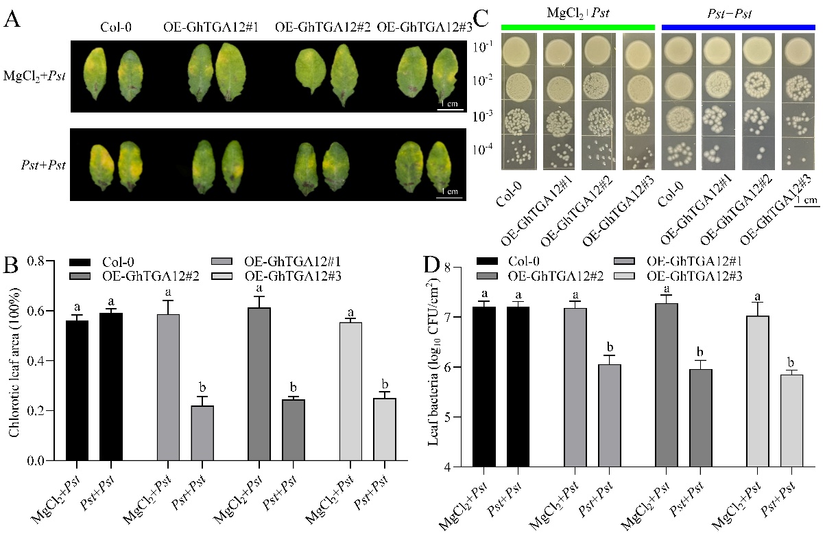 图1 Pst DC3000 预处理后过表达GhTGA12植株较野生型植株表现出增强的抗病性